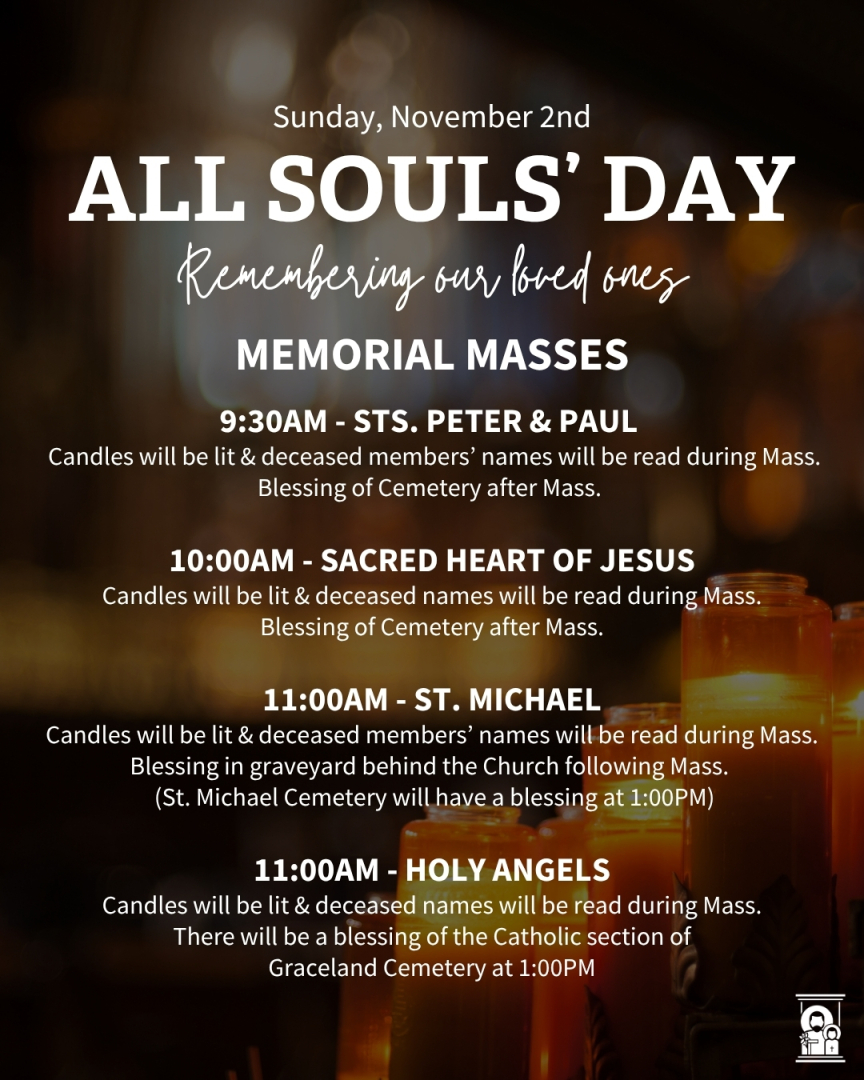 9:30AM at Sts. Peter & Paul (Candles will be lit & deceased members’ names will be read during Mass. Blessing of Cemetery after Mass.)