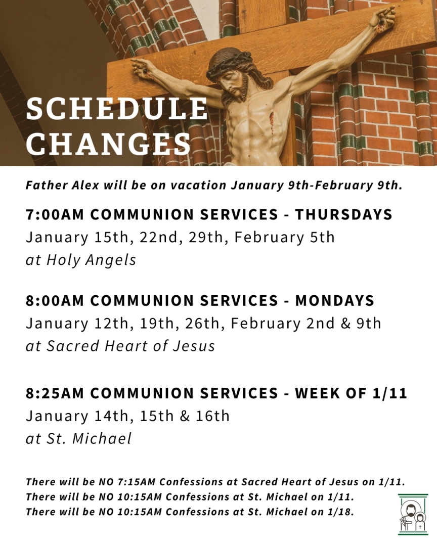 - 8:25AM Communion Services: January 14th, 15th & 16th at St. Michael