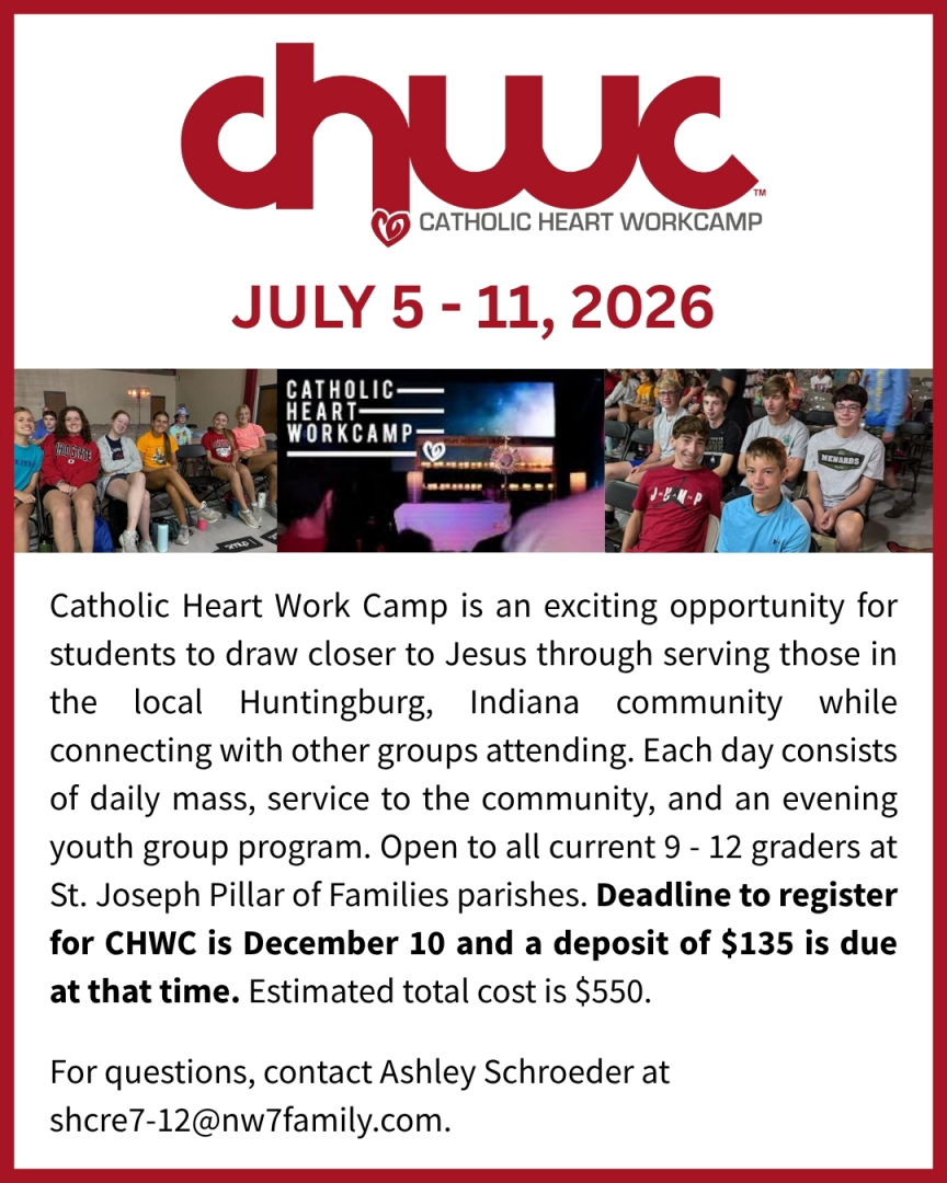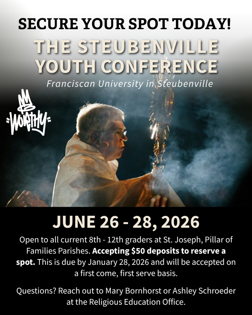 Take Our Survey: St. Joseph Pillar of Families Parishes is pleased to announce that we will have a Family Parish Mission on March 1-4, 2026 with renowned speaker, Joe Farris. More details coming soon! Please take time to answer the survey to help ensure a successful mission for our family of parishes. Click here to access the survey. Thanks in advance.